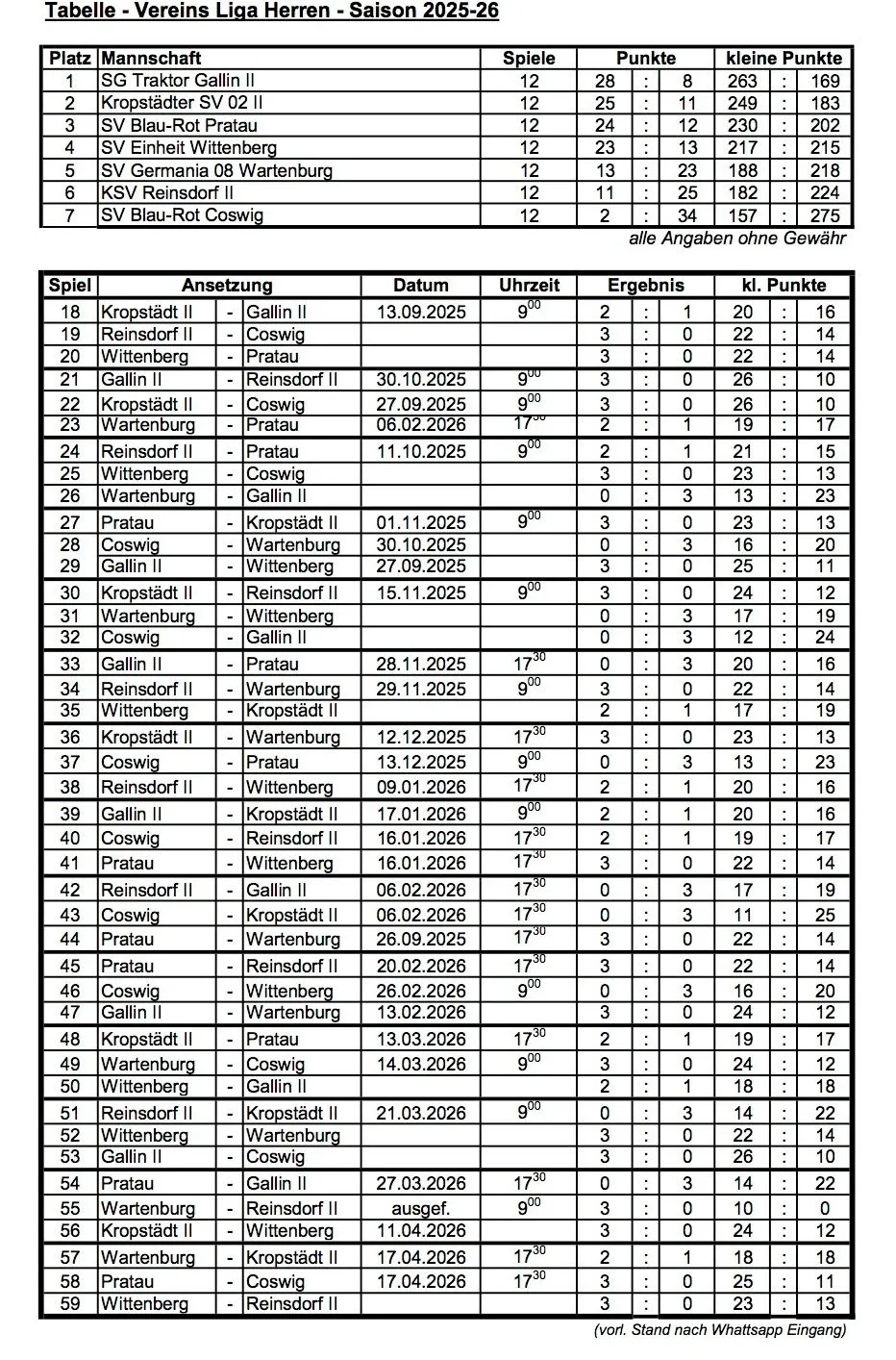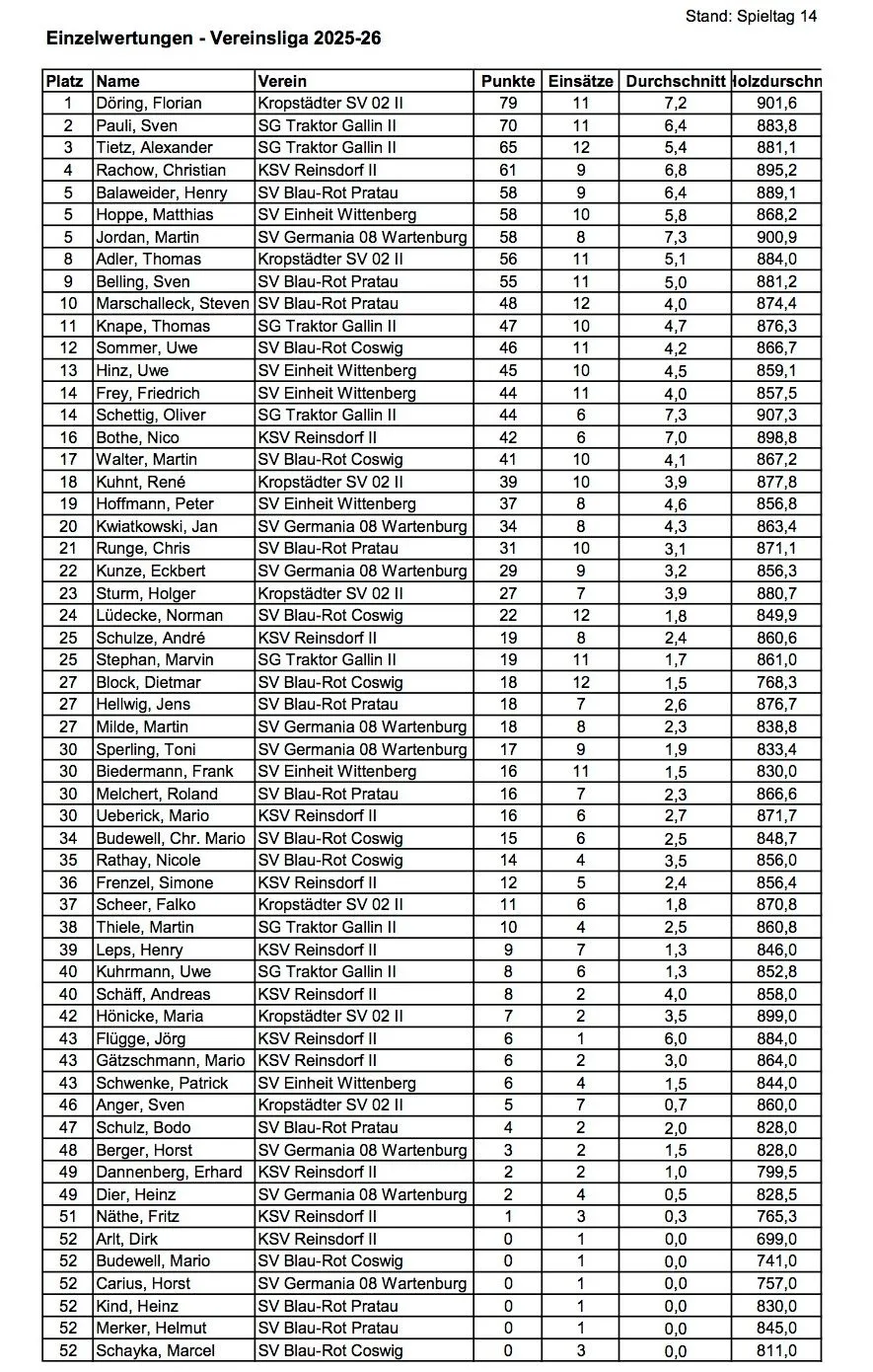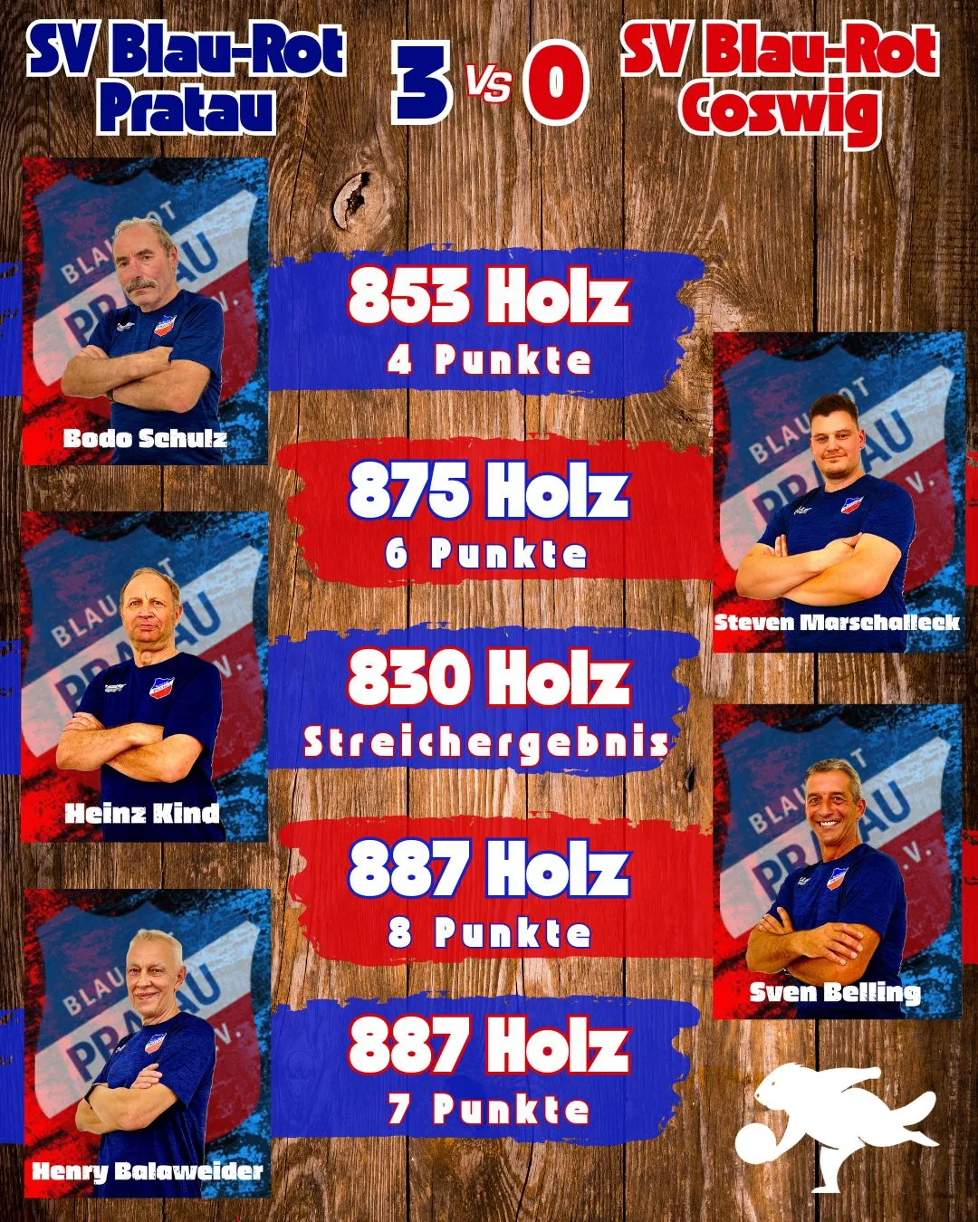 Somit ging das letzte Saisonspiel 3502 zu 3378 Holz, im Mannschaftsergebnis, aus und 25 zu 11 Punkte für die Einzelspieler, 3-0 für Pratau. 3. Platz in der Vereinsliga ist damit gesichert und man musste sich leider ganz knapp den Mannschaften aus Gallin und Kropstädt geschlagen geben, die in dieser Saison mit individueller Klasse, einfach besser waren.